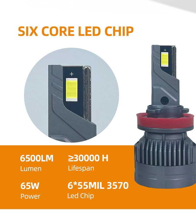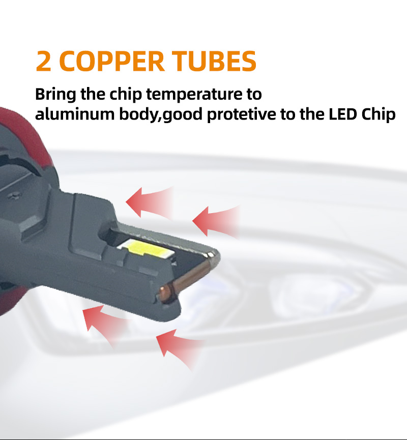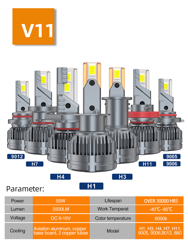 • Super bright LED car light bulb 55w with smart base to fit all cars. 2 copper pipes, 10000 rpm cooling fan and 6063 aviation aluminum make up the powerful cooling system. Good light!